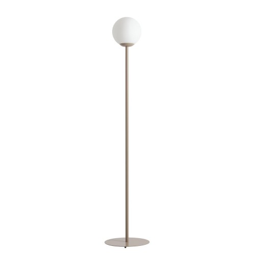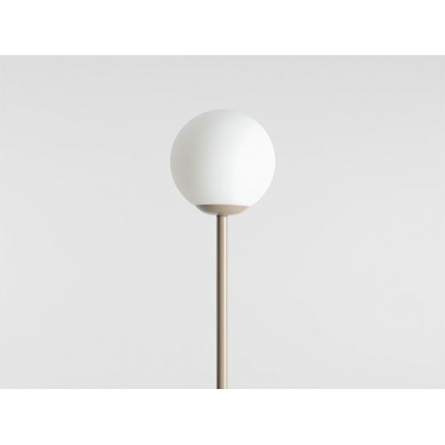 Модерен лампион с минималистичен дизайн от серията Pinne, изработен от бежов цвят кръгла метална основа с дълго рамо и бял цвят сферична стъклена чашка на цокъл Е27. Оригинално предложение за комфортното и стилно осветление на вашия хол, трапезария, спалня, офис, хотел и заведение.