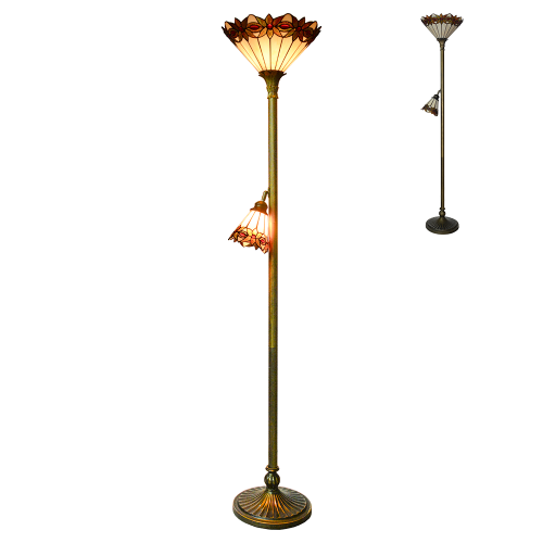 Класически лампион, изработен от антично кафяв цвят метална основа и рамо с подвижна стилна конусовидна шапка от стъкло Тифани с декоративни елементи в бежов и кехлибар цвят, и шапка насочена нагоре. Лампион, подходящ за осветление във вашия хол, трапезария, спалня, хотел или ресторант.