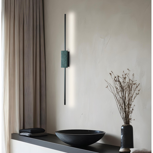 Оригинален светодиоден аплик от серията Ellaria, изработен от черен цвят метална основа и декоративен зелен керамичен детайл с дълго метално рамо и бял пластмасов разсейвател с индиректно разпръскване на светлината и вграден 17W 3000К LED. Стилно предложение за интериорното осветление на вашия хол, трапезария, хотел и заведение.