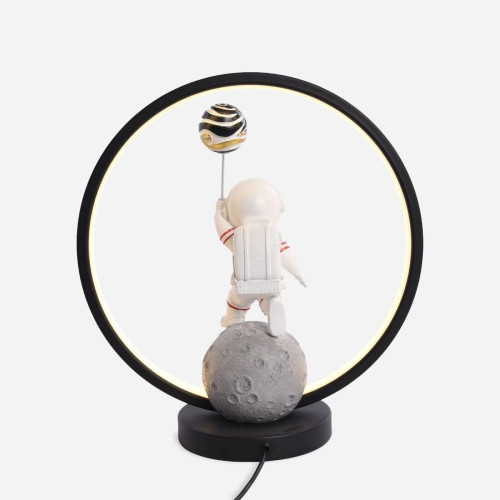 Оригинална светодиодна детска настолна лампа от серията Astronauta, изработена от черен цвят метално тяло във формата на ринг с бял пластмасов разсейвател и фигурка на астронавт върху астероид от смола с USB изход за зареждане и мощност от 4W 3000K LED. Чудесно предложение за декоративното осветление на всяка детска стая.