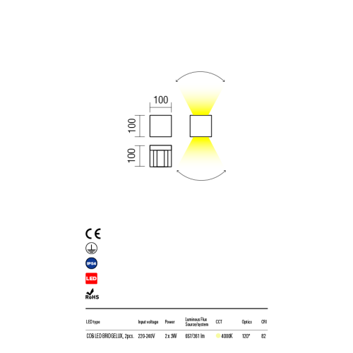 Максимална мощност: 2 x 6W, 720lm, 3000K, Bridgelux LED, CRI>80 (вкл.)