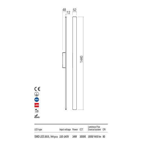 Размери: Височина: 1440мм, Ширина: 52мм, Разстояние от стената: 48мм