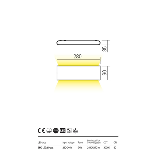 Елегантен и модерен led фасаден аплик, изработен от бял цвят правоъгълно алуминиево тяло със заоблени ъгли и сатен стъклен разсейвател светещ двустранно, с вграден светодиод от 24W LED, 3000K, 1250lm, CRI>80 и висока степен на влагозащита: IP54. Аплик, който ще придаде уютна светлина и модерен стил на терасата, градината и фасадата на вашия дом, хотел или ресторант.