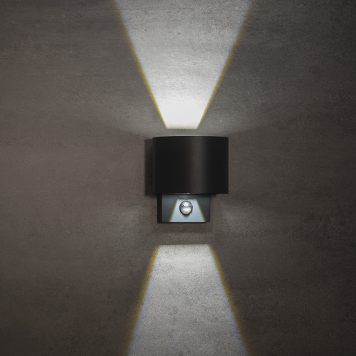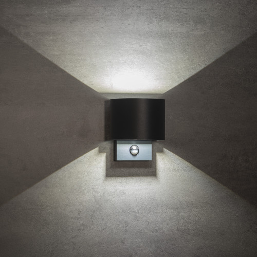 Reka е съвременен LED фасаден аплик, който е очарователен, благодарение на своята чиста и модерна форма, светещ двустранно с променлив градус на осветеност. Изработен от антрацит цвят овално алуминиево тяло с вграден датчик за движение и 7W LED, 4000K, 340lm, с висока степен на влагозащита: IP54. Осветително тяло, придаващо блясък и стил на вашата фасада.