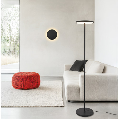 Стилен светодиоден лампион с модерен дизайн от серията Demy, изработен от черен цвят метална основа с кръгла плоска метална глава и бял поликарбонатен разсейвател с вграден 18W, 3000К LED. Оригинално предложение за комфортното осветление във вашия хол, трапезария, офис, хотел и заведение.