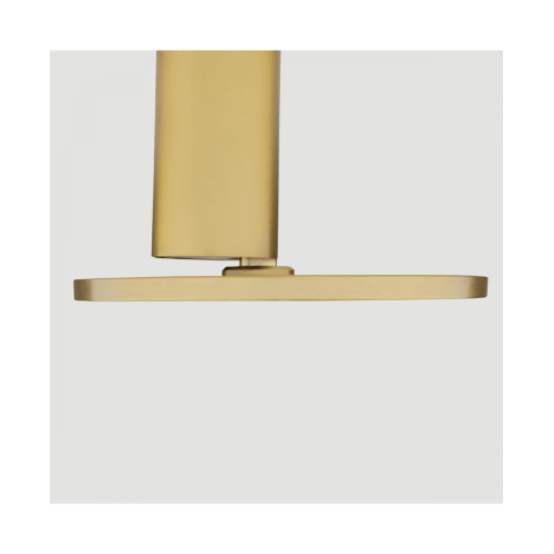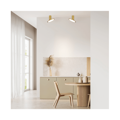 Оригинална светодиодна луна за външен монтаж с функционален дизайн, изработена от матово златист цвят цилиндрична алуминиева основа и подвижна кръгла плоска алуминиева глава с ъгъл на наклон 90° и бял поликарбонатен разсейвател с вграден 12W LED, 3000K с ъгъл на осветеност 120°. Модерно предложение за интериорното осветление на вашия хол, трапезария, спалня, коридор, офис, хотел или заведение.
