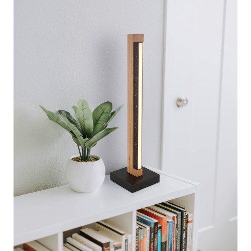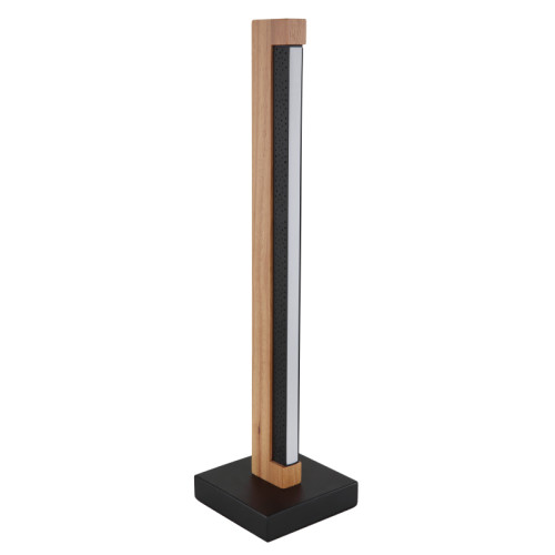 Оригинална светодиодна настолна лампа от серията Starla, изработена от черен цвят квадратна метална основа и тяло от натурално дърво в комбинация с черен мат алуминий и бял пластмасов разсейвател с вграден 8W 3000К LED. Модерна лампа, подходяща за осветлението на вашия хол, трапезария, спалня, офис, хотел и заведение.