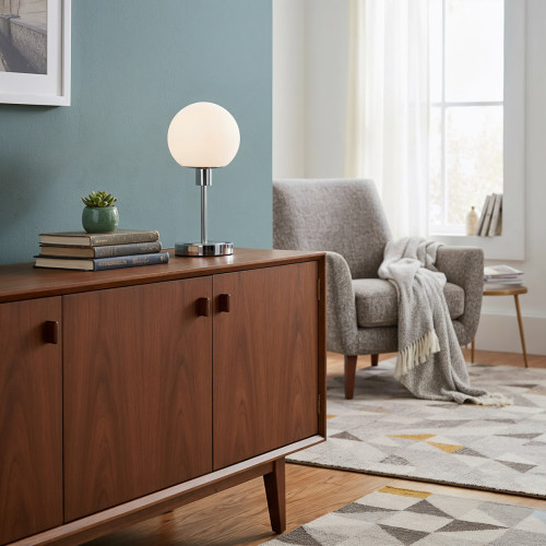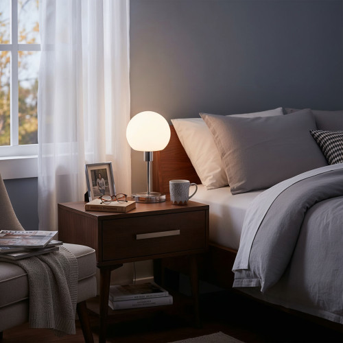 Класическа светодиодна настолна лампа от серията Cave, изработена от цвят хром метална основа и опал стъклена чашка в сферична форма с вграден 4.8W, 3000K LED. Стилно допълнение за интериорното осветление на вашия хол, трапезария, спалня, хотел и заведение.