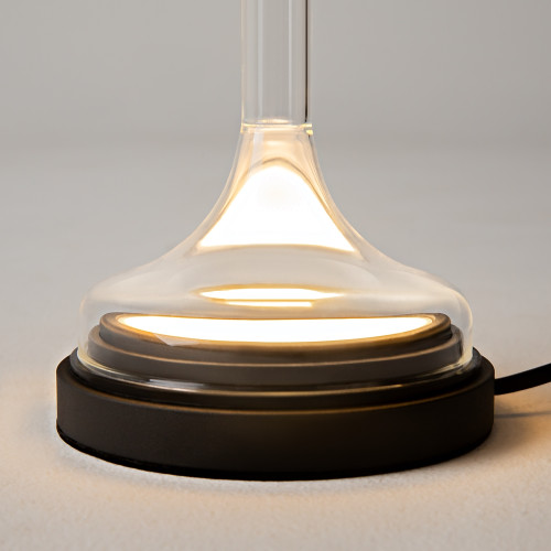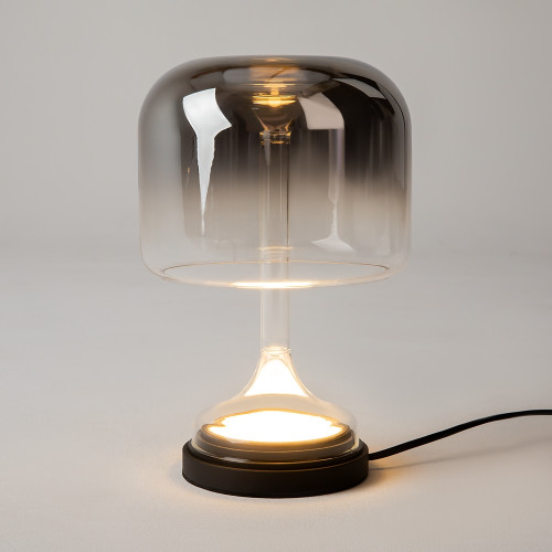 Оригинална светодиодна настолна лампа от серията Spirito, изработена от черен цвят метална основа с рамо и чашка от градиентно лято стъкло в опушен нюанс и вграден 13W LED, 3000K. Стилно предложение за осветлението на вашия модерен хол, трапезария, спалня, хотел или заведение.