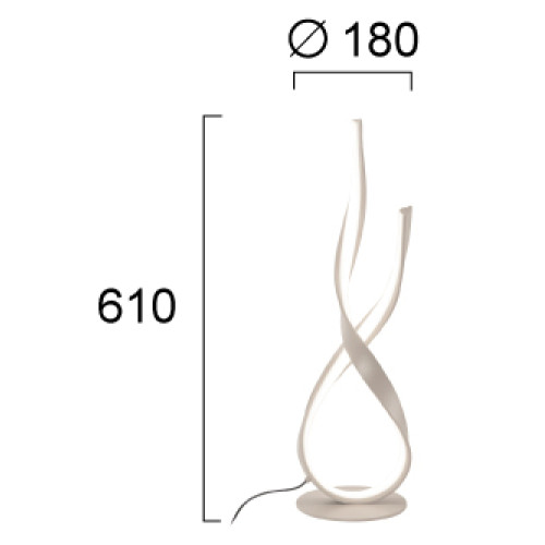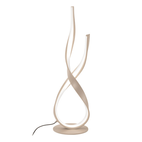 Модерна светодиодна настолна лампа от серията Ribbon, изработена от бежов цвят метална основа и тяло от спираловидно извита метална лента и бял пластмасов разсейвател с вграден 21W 3000К LED. Оригинална лампа, подходяща за интериорното осветление на вашия хол, трапезария, спалня, хотел и заведение.