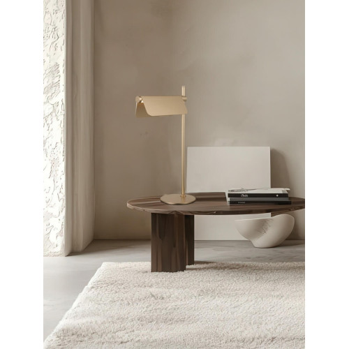 Модерна светодиодна настолна лампа с функционален дизайн, изработена от матово златист цвят метална основа и рамо с цилиндрично алуминиево тяло и подвижни алуминиеви светлинни дефлектори с акрилен разсейвател и вграден 7W 3000К LED с ключ за димиране. Стилна лампа, подходяща за оригиналното и комфортно осветление на вашия хол, трапезария, спалня, офис, хотел и заведение.