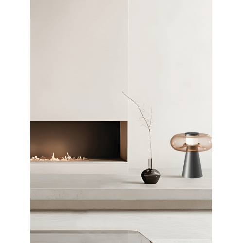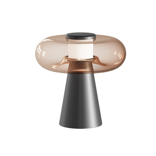 Модерна светодиодна настолна лампа със стилен дизайн, изработена от цвят черен мат конусовидна алуминиева основа с акрилен разсейвател и кафява стъклена чашка с вграден 18W 3000К LED и ключ за димиране с докосване. Оригинална лампа, подходяща за интериорното осветление на вашия хол, трапезария, спалня, кабинет, хотел и заведение.