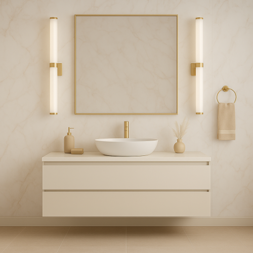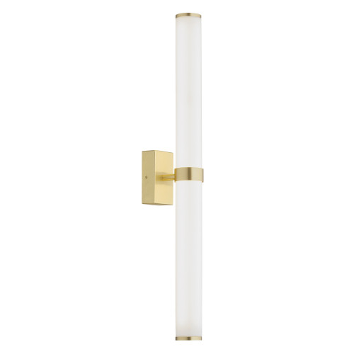 Стилен светодиоден аплик от серията Batumi, изработен от цвят месинг метална основа и опал стъклен разсейвател в цилиндрична форма с вграден 24W, 3000K LED. Модерна лампа с висока степен на влагозащита: IP44, подходяща за качественото осветление на всяка баня и мокро помещение във вашия дом, хотел и ресторант.