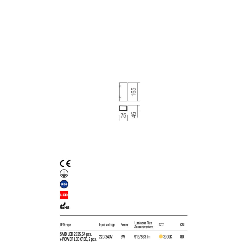 Максимална мощност: 1 x 8W, CREE LED, 3000K, 583lm, CRI>80