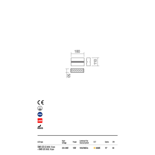 Максимална мощност: 1 х 15W, 980lm, 3000K, Epistar LED