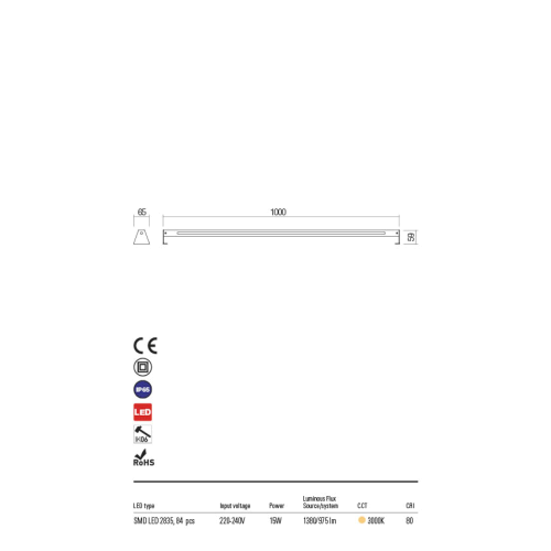 Размери: Височина: 65мм; Дължина: 1000мм, Разстояние от стената: 59мм