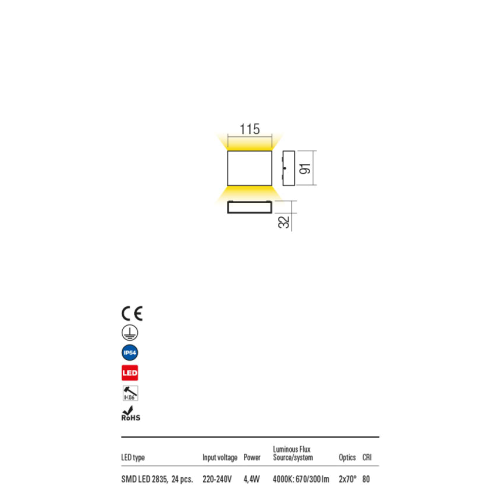 Размери: Височина: 91мм, Дължина: 115мм, Разстояние от стената: 32мм
