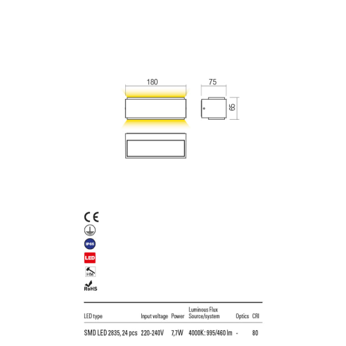 Размери: Височина: 65мм, Дължина: 180мм, Разстояние от стената: 75мм