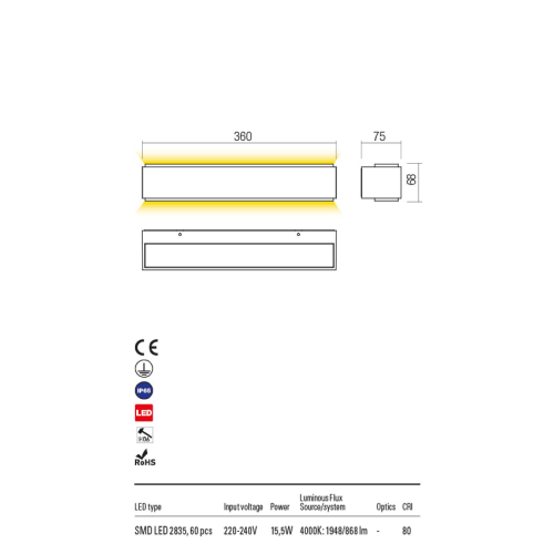 Размери: Височина: 68мм, Дължина: 360мм, Разстояние от стената: 75мм