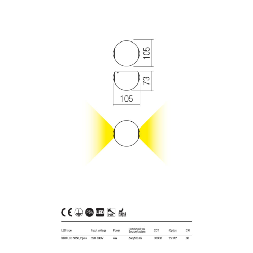 Размери: Височина: 105мм, Диаметър: 105мм, Разстояние от стената: 73мм