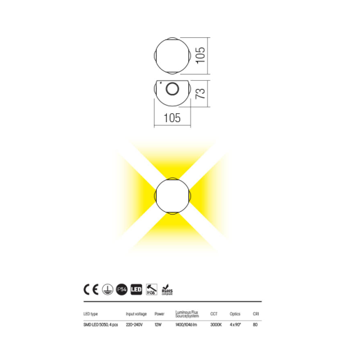 Размери: Височина: 105мм, Диаметър: 105мм, Разстояние от стената: 73мм