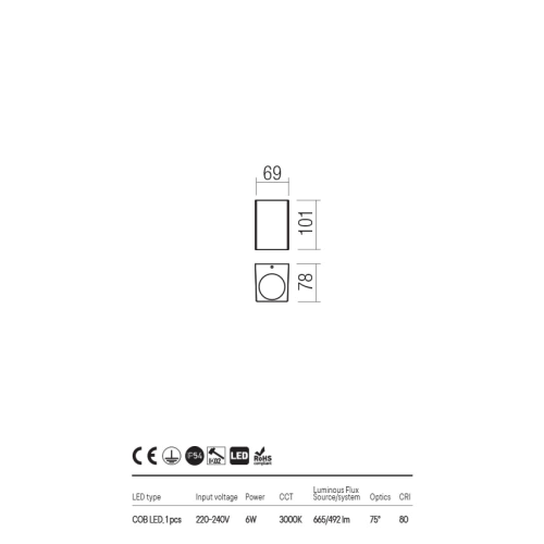 Максимална мощност: 1 х 6W, 3000K, 492lm, CRI>80 (вкл.)