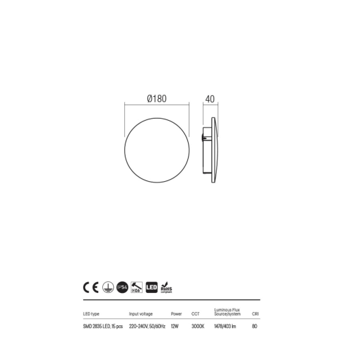 Максимална мощност: 12W, 3000K, 403lm, CRI>80 (вкл.)