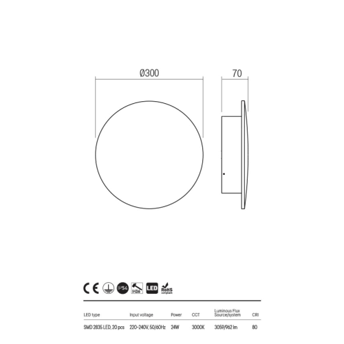 Размери: Диаметър: 300мм, Разстояние от стената: 70мм