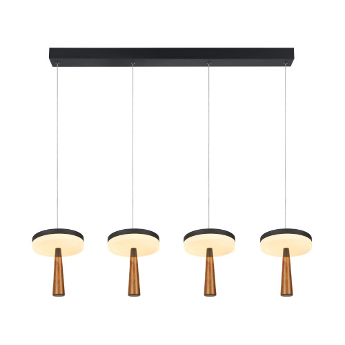 Стилен и модерен светодиоден пендел от серията Asian, изработен от черен мат цвят правоъгълна метална основа и четири висящи тела с бял опал пластмасов разсейвател, и декоративен дървен елемент, с мощност 42W LED CCT, 2700K - 3000K - 4000K, 2730lm. Пендел, подходящ за осветление във вашия хол, трапезария, хотел и ресторант.