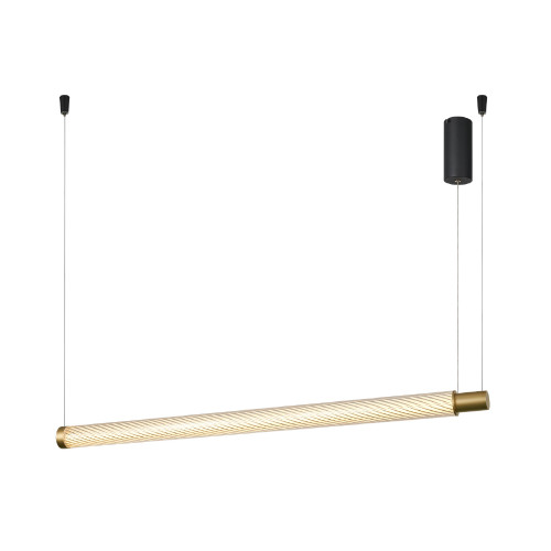 Стилен и модерен светодиоден пендел от серията Mystique, изработен от черен мат цвят метална основа и матиран месинг цвят цилиндрично оребрено тяло с пластмасов разсейвател, с мощност 42W LED CCT, 2700K - 3000K - 4000K, 2520lm. Пендел, подходящ за осветление във вашия хол, трапезария, хотел и ресторант.