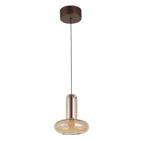 Модерен светодиоден пендел от серията Carote, изработен от цвят мед метална основа и стъкленя чашкя в цвят кехлибар с вграден 5W LED, 3000K. Стилно предложение за комфортното осветление на вашия хол, трапезария, спалня, офис, хотел и заведение.