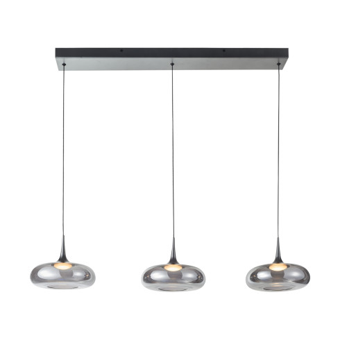 Стилен светодиоден пендел от серията Tenele, изработен от цвят сребрист метална основа и три стъклени чашки в опушен цвят с вграден 21W LED, 3000K и възможност за димиране. Модерно предложение за интериорното осветление на вашия хол, трапезария, спалня, офис, хотел и заведение.