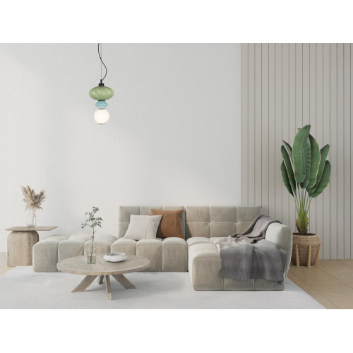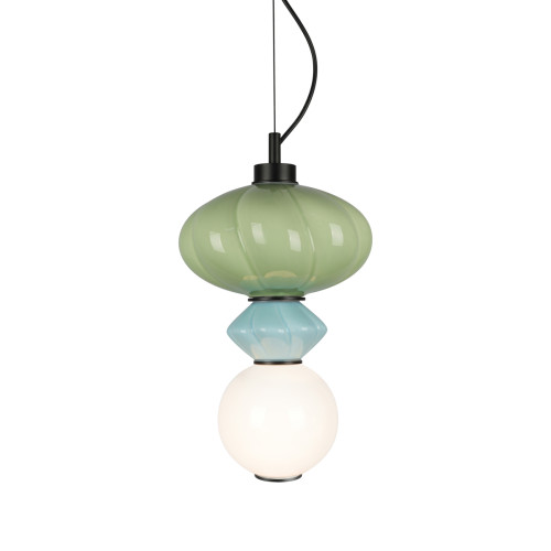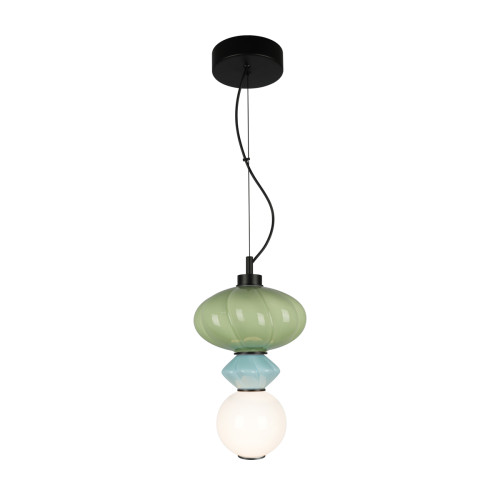 Стилен светодиоден пендел от серията Tordi, изработен от черна метална основа и геометрично тяло, съставено от декоративни керамични елементи в зелен и син цвят с опал стъклен разсейвател и вграден 8W 3000K LED. Атрактивна лампа, подходяща за модерното осветление на вашия хол, трапезария, спалня, хотел и заведение.