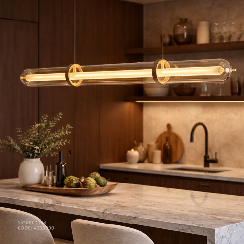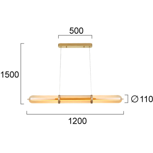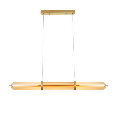 Оригинален светодиоден пендел, изработен от златист цвят метална основа и хоризонтален цвят кехлибар стъклен разсейвател в цилиндрична форма с вграден 34W, 2400К LED. Модерно предложение за качественото и комфортно осветление на вашия хол, трапезария, спалня, хотел и ресторант.