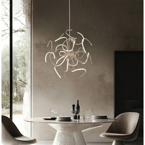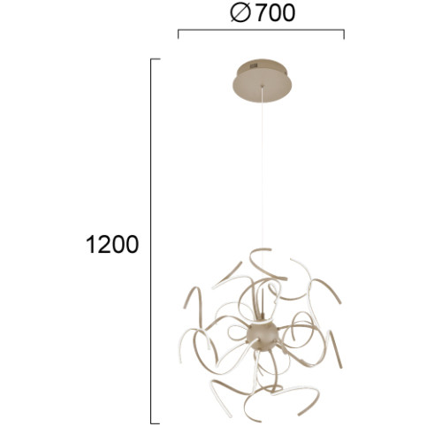 Стилен светодиоден пендел от серията Ivana, изработен от бежов цвят метална основа и сферично метално тяло със спираловидно извити метални ленти и вграден 39W 3000К LED. Модерно решение за интериорното осветление на вашия хол, трапезария, хотел и заведение.