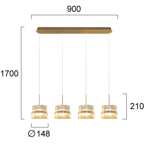 Модерен светодиоден пендел от серията Luxe, изработена от цвят месинг метална основа и четири оребрени стъклени чашки в цвят кехлибар с вграден 46W 3000К LED. Стилно предложение за интериорното осветление на вашия хол, трапезария, хотел и заведение.