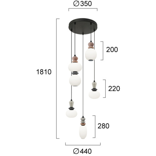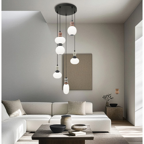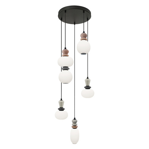 Модерен светодиоден пендел от серията Gemma, изработен от черен цвят метална основа и пет тела, съставени от оригинални декоративни керамични детайли в сив, бежов и кафяв цвят с опал стъклени разсейватели и вграден 27W, 3000K LED. Стилно решение за комфортното осветление на вашия хол, трапезария, спалня, офис, хотел или заведение.