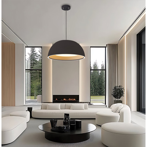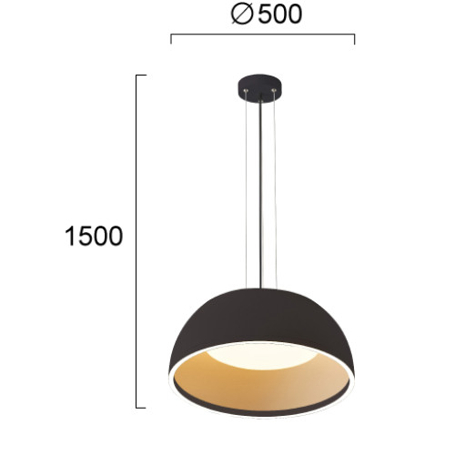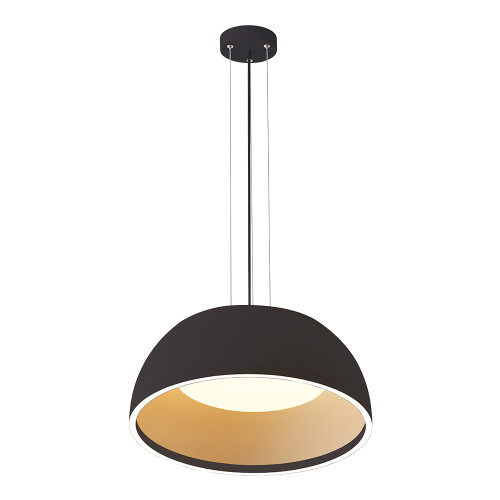 Стилен светодиоден пендел с модерен дизайн, изработен от черен цвят метална основа и куполовидна форма метална шапка в черен цвят отвън и златист отвътре с бял поликарбонатен разсейвател и вграден 50W, 3000K LED. Оригинална лампа, подходяща за осветление на вашия хол, трапезария, спалня, хотел и заведение.