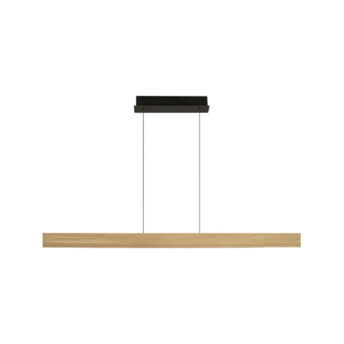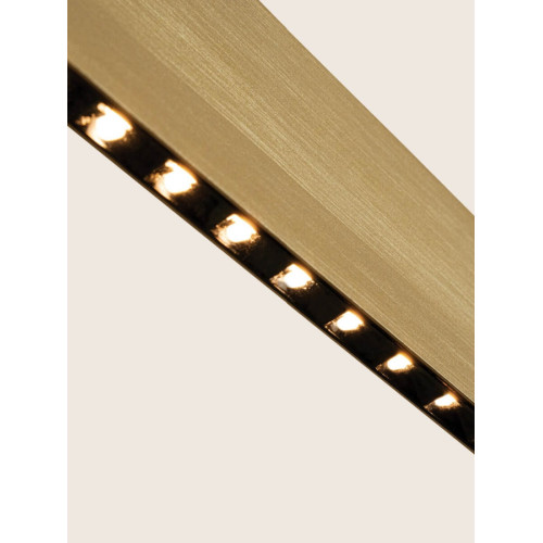 Съвременен светодиоден пендел с минималистичен дизайн, изработен от черен цвят метална основа и висящо линейно алуминиево тяло в матово златист цвят със силиконов разсейвател и вграден 46W, 3000K LED. Тялото е с димируем TRIAC драйвер. Стилно предложение за интериорното осветление на вашия хол, трапезария, спалня, офис, хотел и заведение.