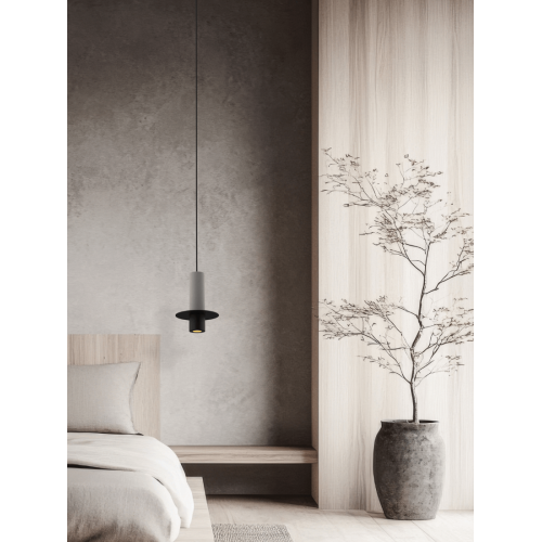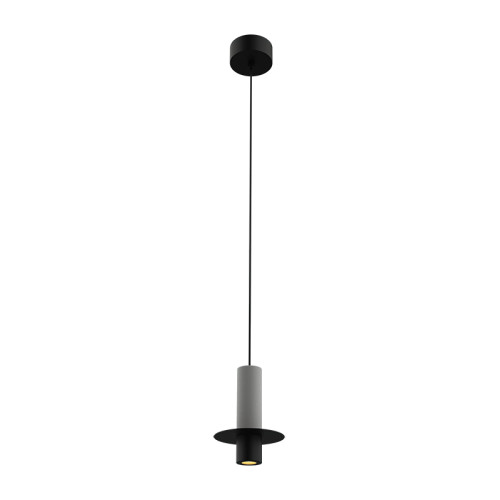 Стилен светодиоден пендел с модерен дизайн, изработен от черен мат цвят метална основа и цилиндрично бетонно тяло с декоративен метален диск и черен мат метална глава с вграден 6W, 3000K LED. Качествена лампа, подходяща за интериорното осветление на вашия хол, трапезария, спалня, хотел и заведение.