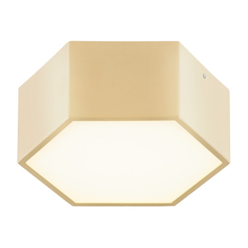 Стилен светодиоден плафон от серията Libero, изработен от златист цвят шестоъгълно метално тяло и бял мат стъклен разсейвател с вграден 12W LED, 3000K. Оригинално предложение за минималистичното интериорно осветление на вашия хол, трапезария, спалня, коридор, офис, хотел и заведение.