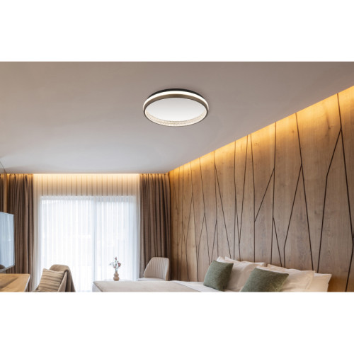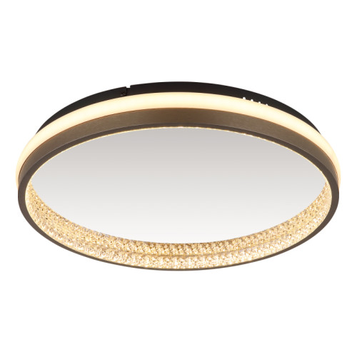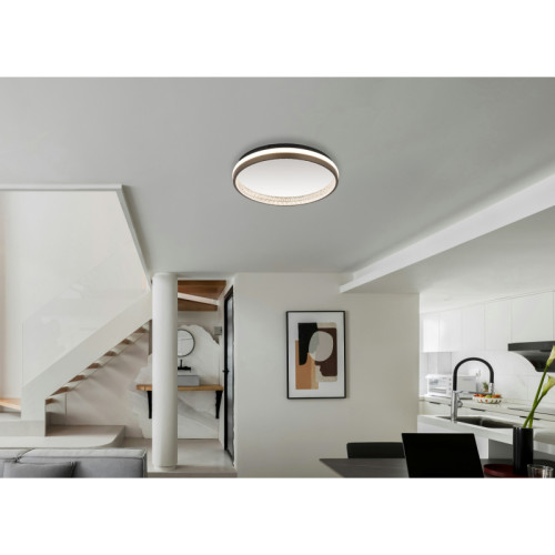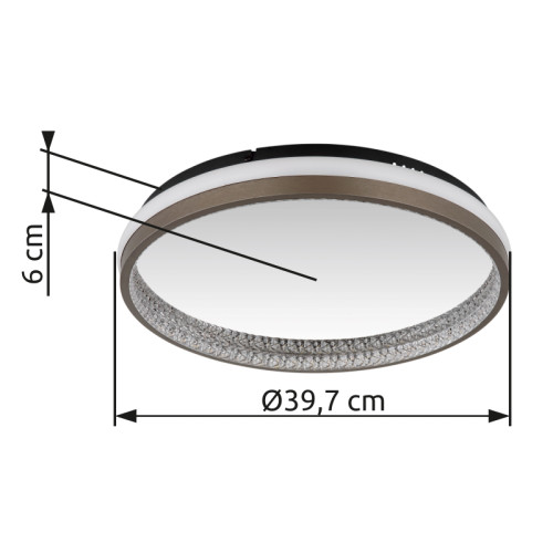 Модерен светодиоден плафон от серията Della, изработен от матово черен цвят метална основа и тъмно сив цвят кръгло алуминиево тяло с бял цвят пластмасов разсейвател и прозрачни пластмасови кристали с вграден 40W LED и възможност за избор на цветната температура: 3000K/4000K/6000K и вграден димер. Качествена лампа, подходяща за интериорното осветление на вашия хол, трапезария, хотел и заведение.