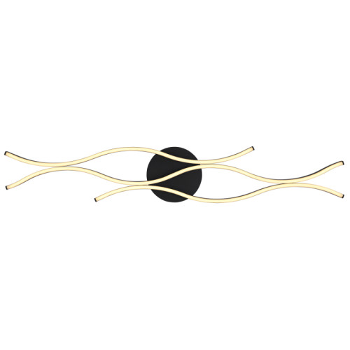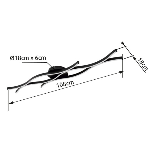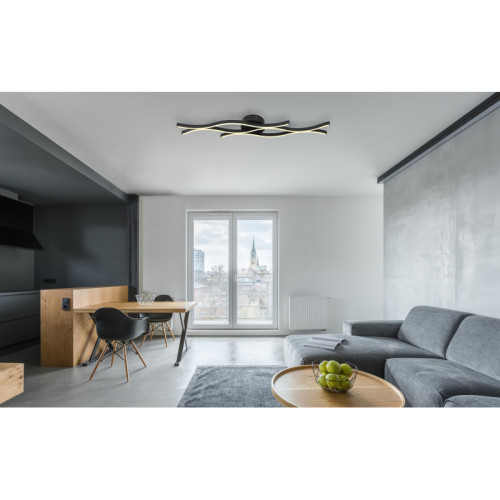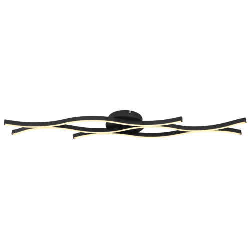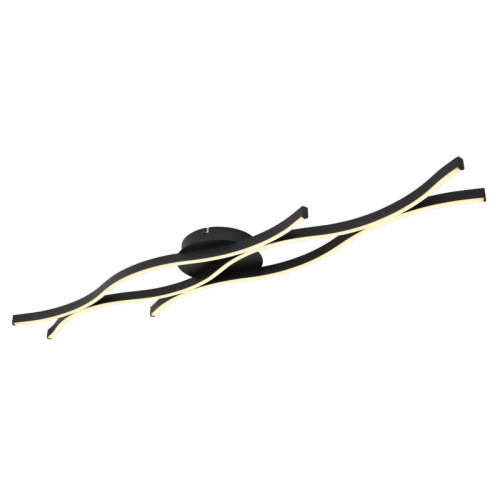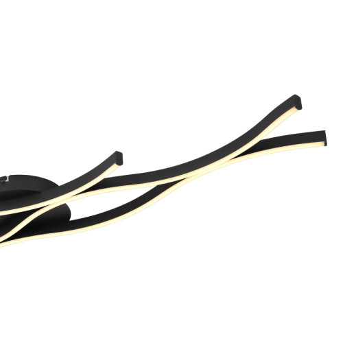 Оригинален светодиоден плафон от серията Geronimo, изработен от черен мат цвят метална основа и три вълнообразни алуминиеви тела в черен мат цвят с бели пластмасови разсейватели и вграден 35W 3000К LED. Модерна лампа, подходяща за осветлението на вашия хол, трапезария, спалня, офис, хотел и заведение.