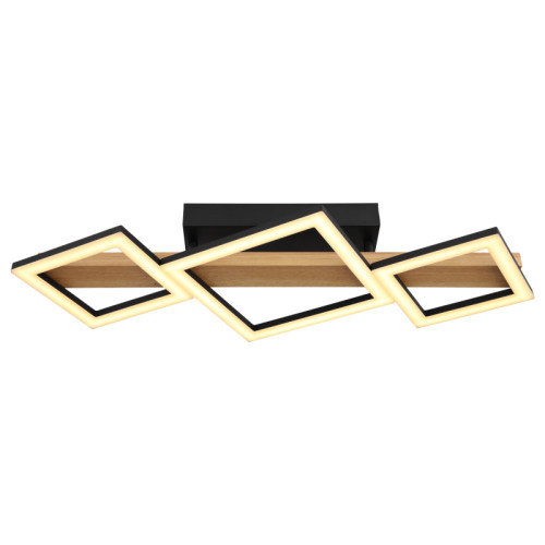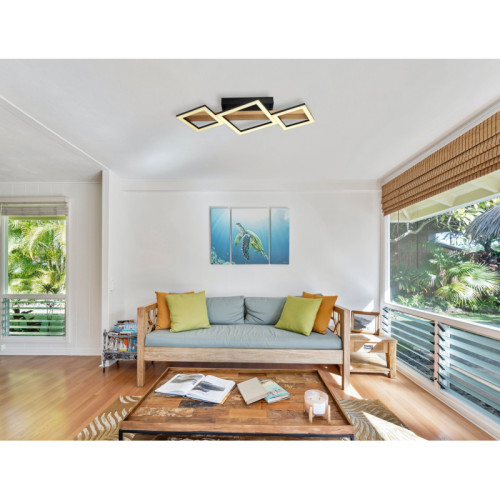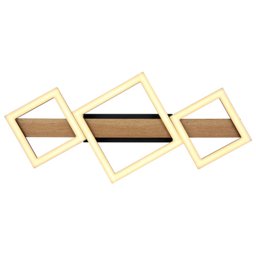 Стилен и модерен LED плафон от серията Dustin, изработен от черен цвят правоъгълна метална основа и рамо от тъмно кафяв цвят дърво с три черен цвят алуминиеви квадрата с опал пластмасови разсейватели. Плафон, подходящ за осветление във вашия хол, трапезария, спалня, хотел или ресторант.