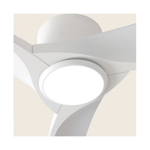 Стилен LED вентилатор с модерен дизайн, изработен от матово бял цвят метално тяло с три пластмасови перки и опал поликарбонатен разсейвател с вграден 18W LED и възможност за избор на цветната температура: 3000K/4000K/6000K. Комплектът е с включено дистанционно управление и стенен ключ. Вентилаторът има функция: зима - лято и включва персонализирани настройки за време (1ч., 4ч. или 8ч.). Тялото е оборудвано с 31W DC мотор с ниво на шум 20 dB и предлага шест настройки на скоростта, осигуряващи ефективен въздушен поток. Прекрасно решение за вашия дом, хотел и ресторант.