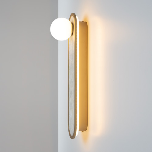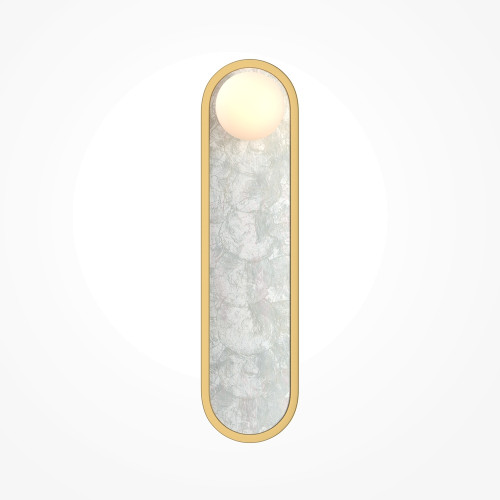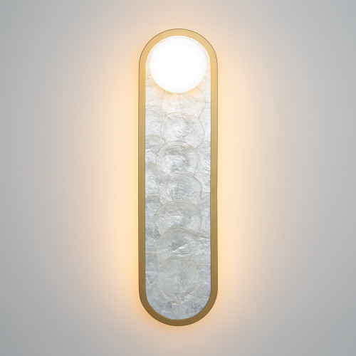 Съвременен светодиоден аплик от серията Blink, изработен от цвят месинг алуминиева основа и елипсовидна алуминиева рамка с акрилен разсейвател и декоративна мозайка от седеф със сферична бяла стъклена чашка и вграден 25W LED с възможност за избор на цветната температура: 2700К/3000К/4000К. Оригинална лампа, която ще придаде уникалност и качествена светлина на вашия хол, спалня, коридор, офис, хотел и заведение.