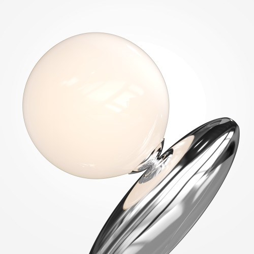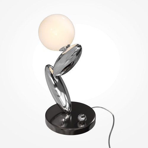 Дизайнерска светодиодна настолна лампа с атрактивна форма, изработена от цвят хром кръгла метална основа и асиметрично метално тяло с опал стъклена сферична чашка и вграден 6W 3000К LED. Тялото е с димируем драйвер Triac и сензорен ключ ON/OFF. Модерно предложение за интериорното осветление на вашия хол, трапезария, спалня, хотел и заведение.
