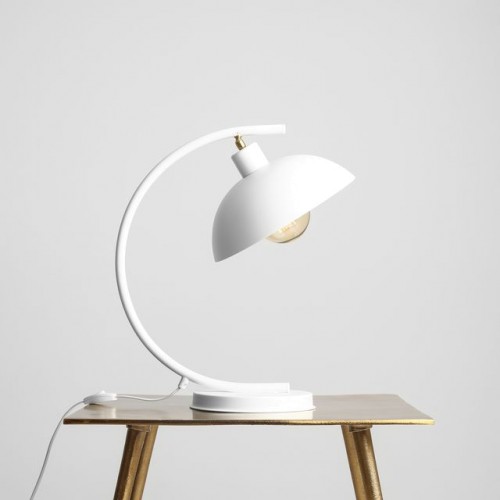 Оригинална настолна лампа с функционален дизайн от серията Espace, изработена от бял мат цвят метална основа с извито рамо и напълно регулириуема полусферична метална чашка в бял мат цвят на цокъл Е27. Модерно решение за комфортното и стилно осветление на вашия хол, трапезария, спалня, кабинет, хотел и заведение.