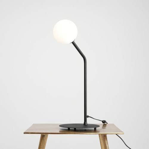 Стилна настолна лампа с минималистичен дизайн от серията Pure, изработена от черен мат цвят кръгла метална основа с рамо и бял мат сферична стъклена чашка на цокъл Е14. Оригинално предложение за комфортното и модерно осветление на вашия хол, трапезария, спалня, хотел и заведение.