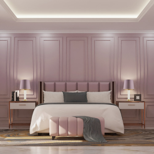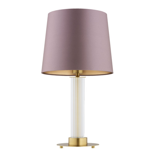 Съвременна настолна лампа от серията Hampton, изработена от месингова основа с набраздено прозрачно стъклено тяло в цилиндрична форма и текстилна шапка в розов цвят отвън и златист във вътрешността. Стилно предложение за интериорното осветление на вашия хол, трапезария, спалня, кабинет, хотел и ресторант.